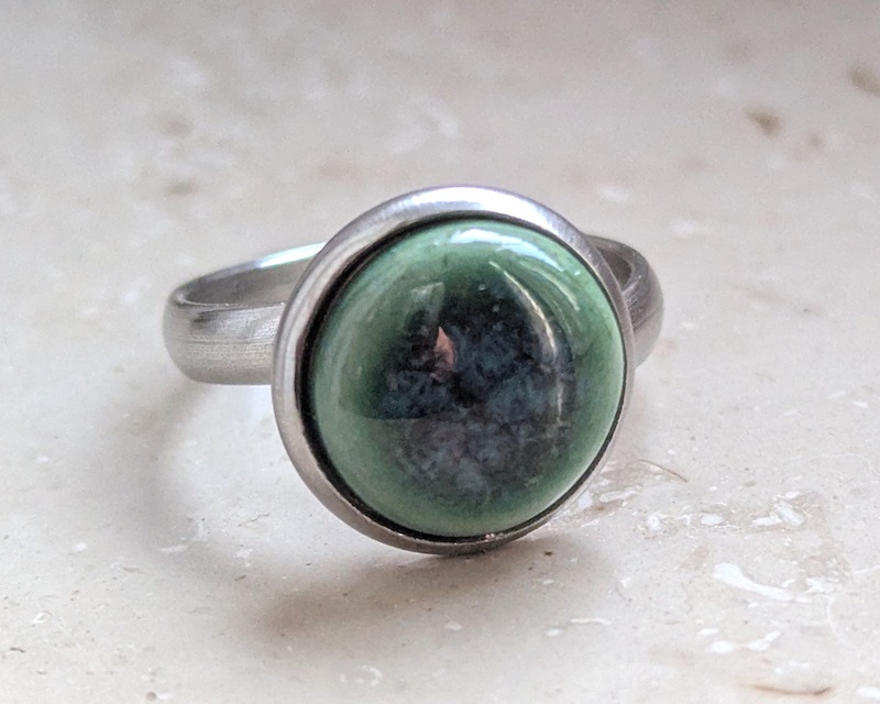 Die grüngesprenkelte Glasuren wurde auf die Keramik aufgetragen und mehrfach gebrannt. Die Keramik ist in den Ringträger aus Edelstahl aufgeharzt.